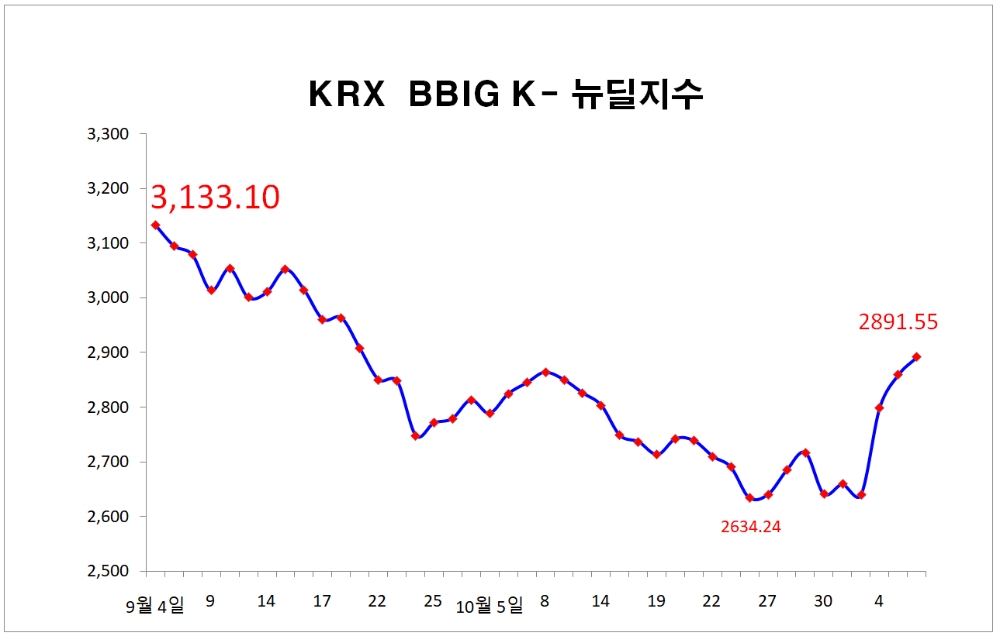 이미지 확대보기KRX BBIG K-뉴딜지수가 이달들어9.48%(250.30포인트) 상승한 2891.55로 마감하며, 코스피 상승률을 크게 앞질렀다.