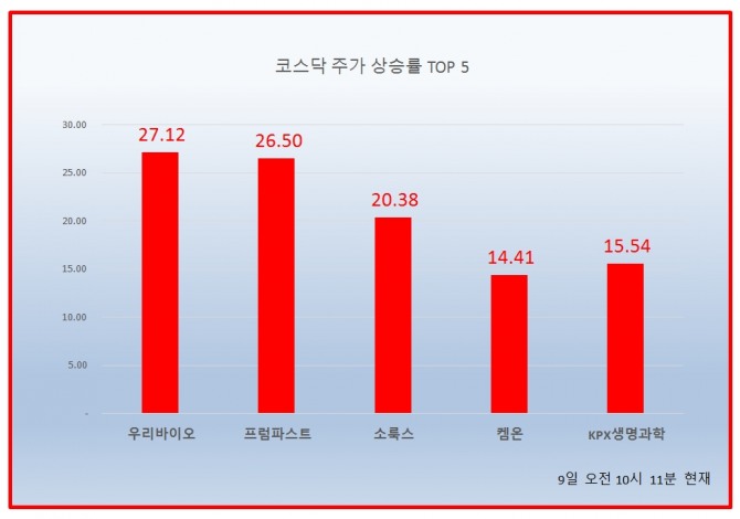 이날 오전 10시 11분 현재 코스닥 상승률 상위 50개 종목은 다음과 같다.