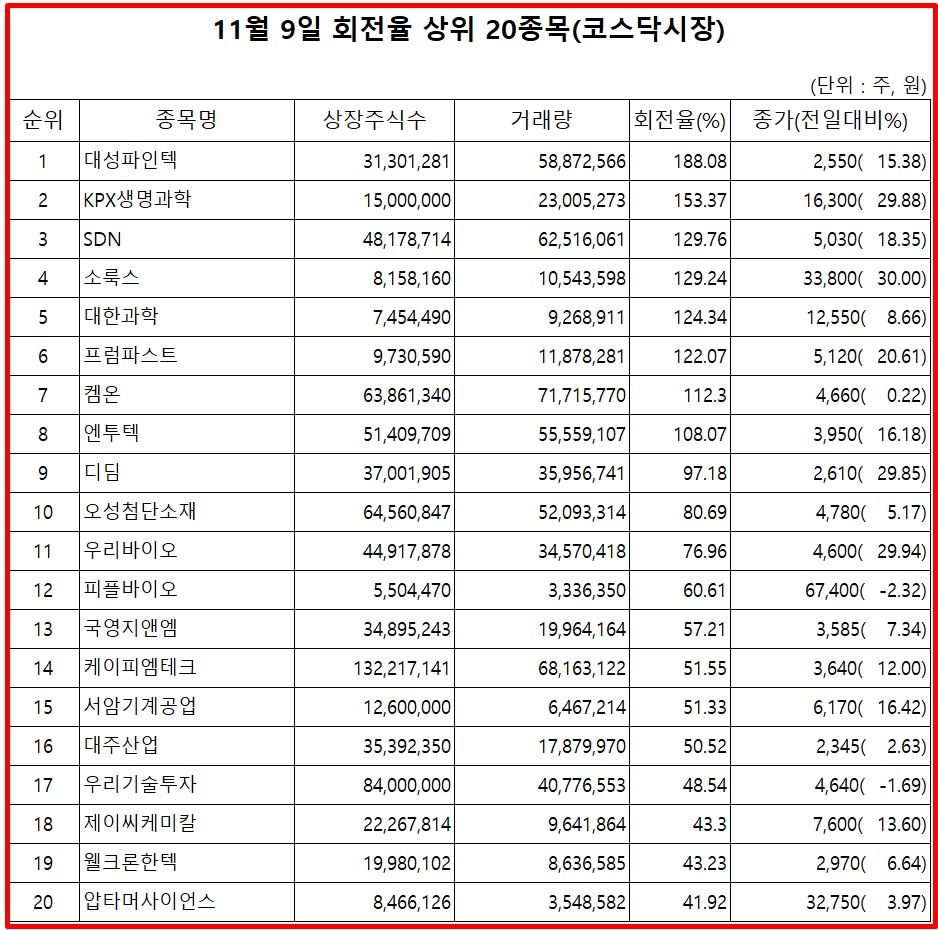 9일 증권시장에서 코스닥 종목의 거래량 회전율 기준 상위 종목은 다음과 같다.