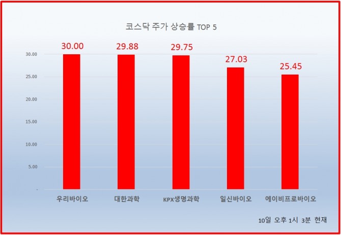 1위 우리바이오 5980원 ( 30% ), 2위 대한과학 16300원 ( 29.88% ), 3위 KPX생명과학 21150원 ( 29.75% ), 4위 일신바이오 7990원 ( 27.03% ), 5위 에이비프로바이오 1045원 ( 25.45% ), 6위 세운메디칼 4560원 ( 23.24% ), 7위 KD 1495원 ( 22.54% ), 8위 명성티엔에스 12200원 ( 21.39% ), 9위 라파스 24000원 ( 17.94% ), 10위 신성델타테크 7240원 ( 17.72% ),
