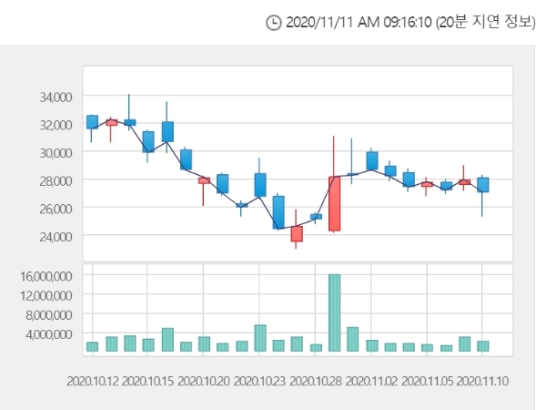 이미지 확대보기11일 한국거래소에 따르면 진원생명과학 주가는 이날 오전 9시 11분 현재 전거래일 대비 5.37% 오른 2만8450원에 거래되고 있다.