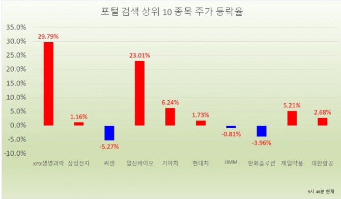 오전 9시 40분 현재 포털사가 집계하는 검색량 기준 상위 20개 종목의 현황은 다음과 같다.