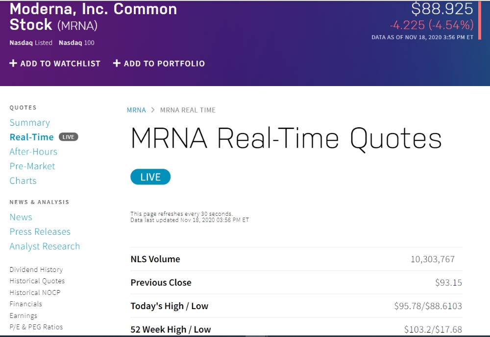 이미지 확대보기미국 뉴욕증시에서 코로나백신 관련주들이 와르르 떨어지고 있다.
