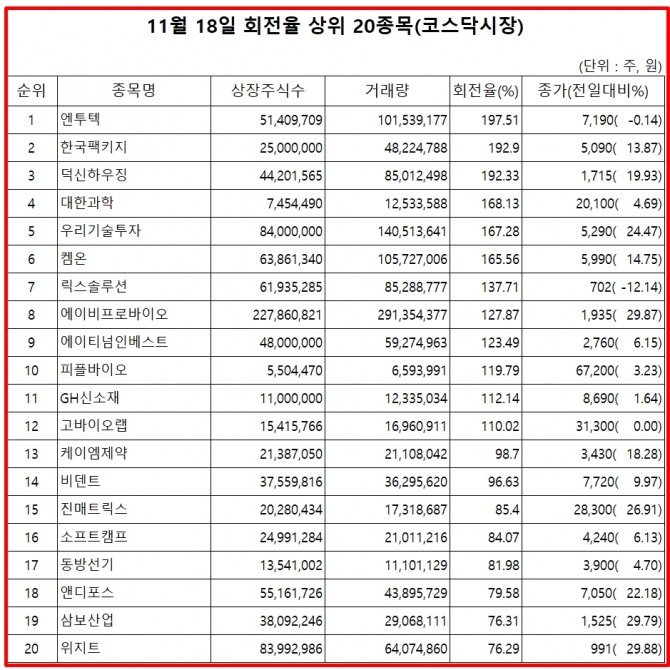 18일 증권시장에서 코스닥 종목의 거래량 회전율 기준 상위 종목은 다음과 같다.