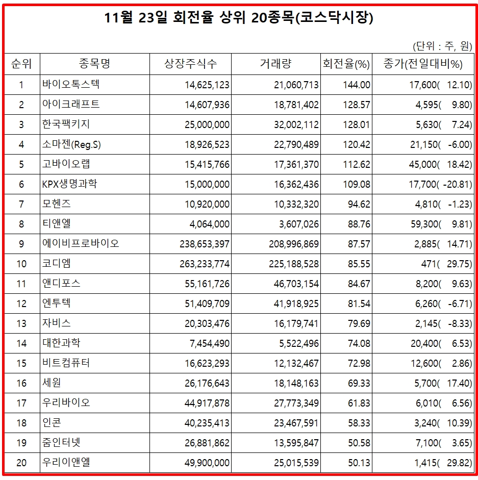 23일 증권시장에서 코스닥 종목의 거래량 회전율 기준 상위 종목은 다음과 같다.