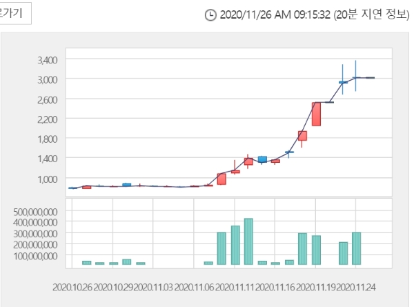 에이프로바이오는 종가기준으로 16일 1365원에서 24일 3000원으로 두 배 넘게 급등했다.