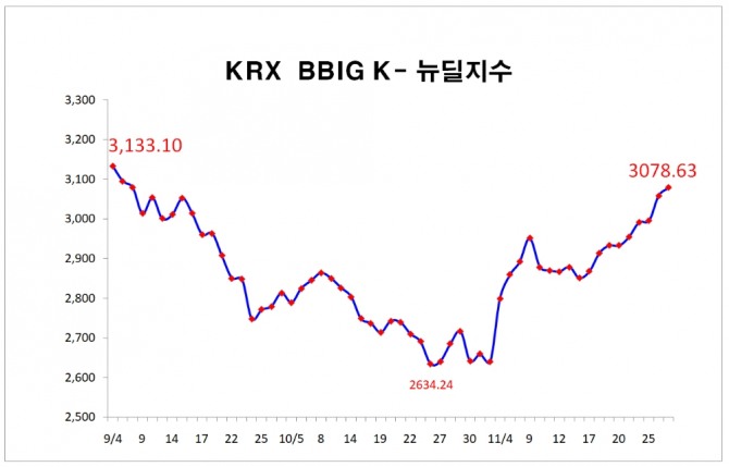 KRX BBIG K-뉴딜지수도 코스피 상승률과 비슷한 437.38포인트(16.56%) 상승한 3078.63을 기록 중이다.