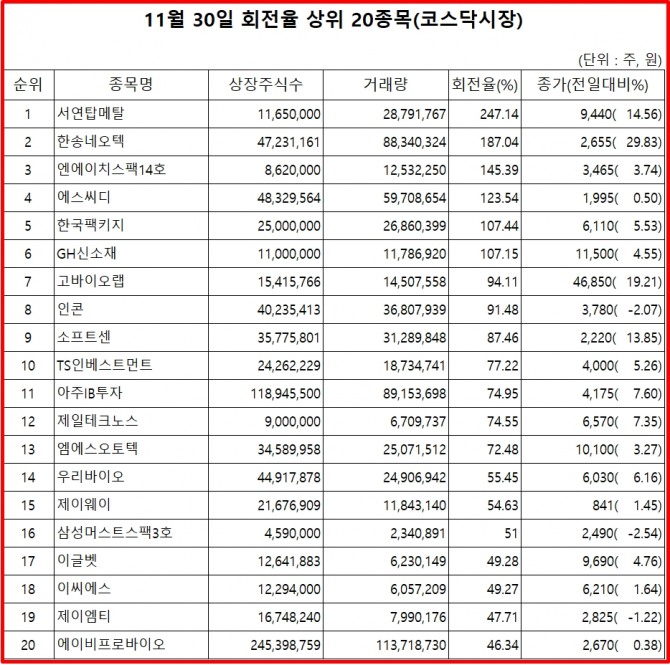 표기순서는 거래량 회전율 순위, 종목명, 거래량 회전율, 30일 종가, 주가 등락율 순이다.