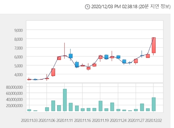 하루만에 오름세로 가격제한폭까지 오른 상한가를 기록중이다. 같은 시간 현재 15% 이상 급등주는 나타나지 않고 있다.