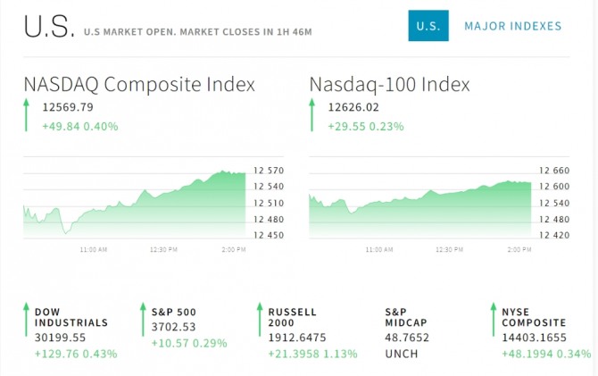 이날 뉴욕증시는 미국의 재정 부양책 협상 등을 주시하는 가운데 하락세로 출발했다가 시간이 지나면서 조금씩 올라 으나 상승세로 돌아섰다 뉴욕증권거래소(NYSE)에서 다우존스 30 산업평균지수와 스탠더드앤드푸어스(S&P) 500 지수 그리고 기술주의 나스닥 지수 모두 오름세다