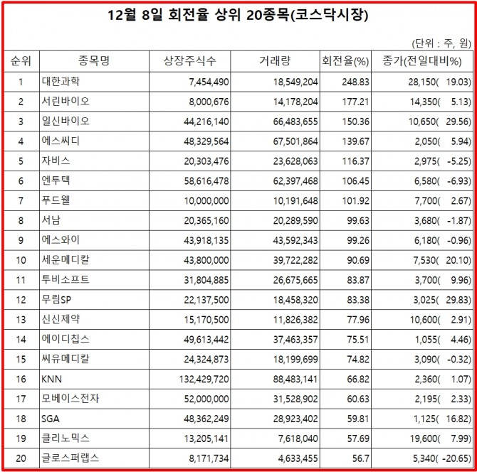 8일 증권시장에서 코스닥 종목의 거래량 회전율 기준 상위 종목은 다음과 같다.