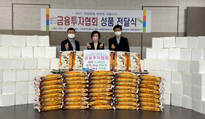 이번 나눔활동에는 코로나 19로 인해 그동안 매년 진행해온 임직원 연탄배달 봉사활동은 생략하고 금융권 공동의 새희망힐링펀드에서 지원한 10kg 쌀 350포와 협회가 마련한 연탄 5000장, 5kg 김장김치100박스를 수색동 주민센터를 통해 전달했다.