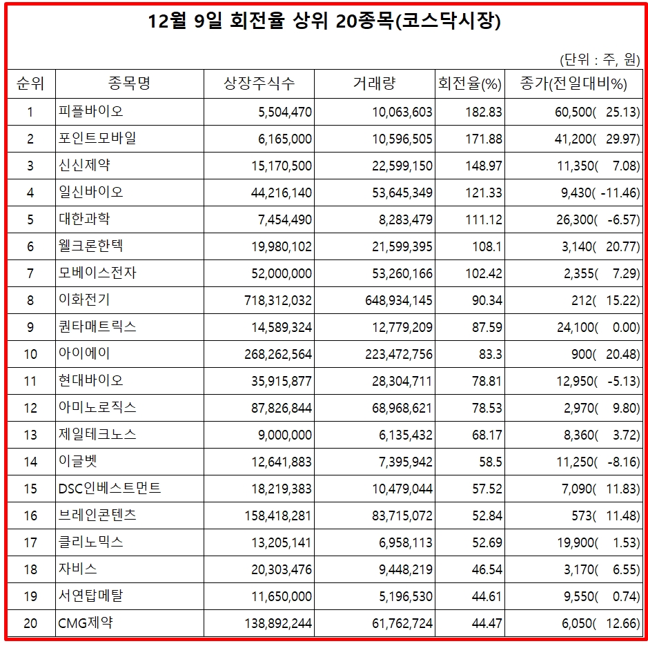 9일 증권시장에서 코스닥 종목의 거래량 회전율 기준 상위 종목은 다음과 같다.