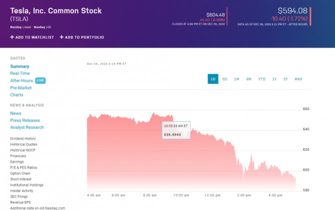 다음은 뉴욕증시 테슬라 주가 마감 시세