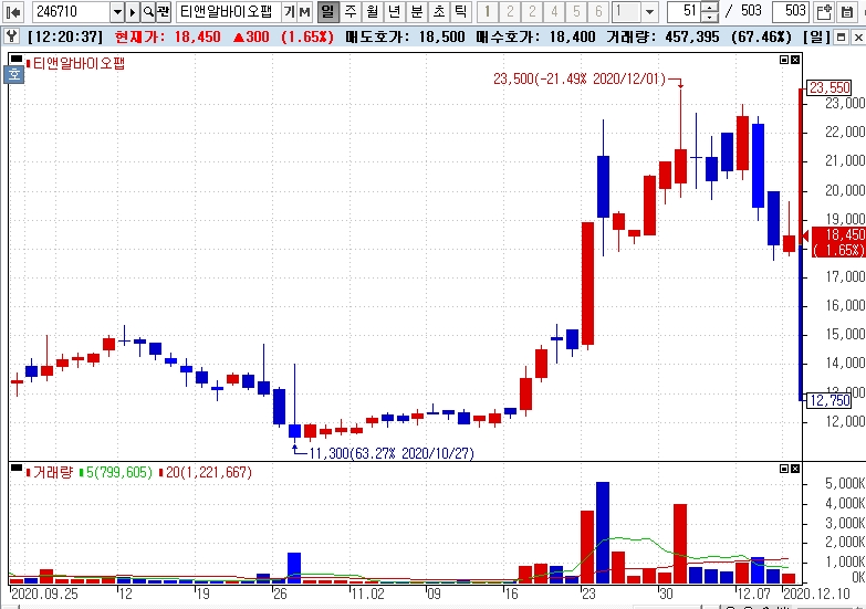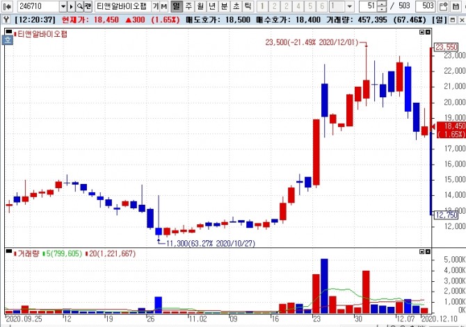 이미지 확대보기이날 12시 20분 현재 티앤알바이오팹은 전일대비 1.65% 상승한 1만8450원에 거래되고 있다.