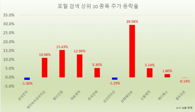 이미지 확대보기오전 11시 20분 현재 포털사가 집계하는 검색량 기준 상위 20개 종목의 현황은 다음과 같다.