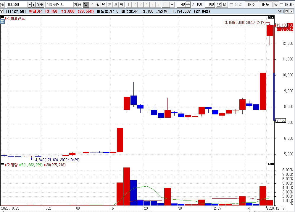 11시 20분 현재 삼화페인트는 전 거래일보다 29.56%(3000원) 오른 1만3150원으로 상한가 기록하고 있다.