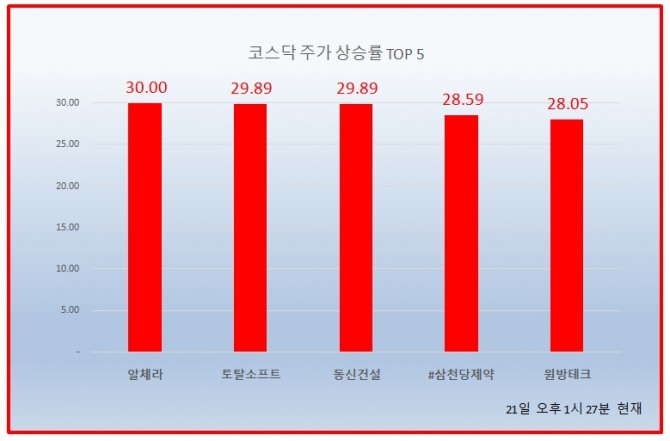 1위 알체라 26000원 ( 30% ), 2위 토탈소프트 6410원 ( 29.89% ), 3위 동신건설 39550원 ( 29.89% ), 4위#삼천당제약 87700원 ( 28.59% ), 5위 원방테크 56600원 ( 28.05% ), 6위 대신밸런스제6호스팩 11250원 ( 27.7% ), 7위 프리엠스 19000원 ( 26.67% ), 8위 인바이오 22550원 ( 22.22% ), 9위#씨아이에스 8730원 ( 21.08% ), 10위#안랩 74500원 ( 16.77% )