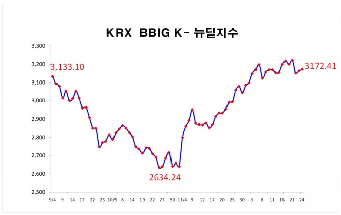 KRX BBIG K-뉴딜지수는 코스피 상승률에는 못 미쳤지만 129.31포인트(4.25%) 상승한 3172.41을 기록했다.