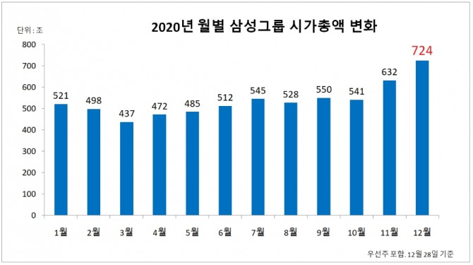 삼성그룹 시가총액이 720조 원을 넘어선 것은 국내 최초의 기록이다.