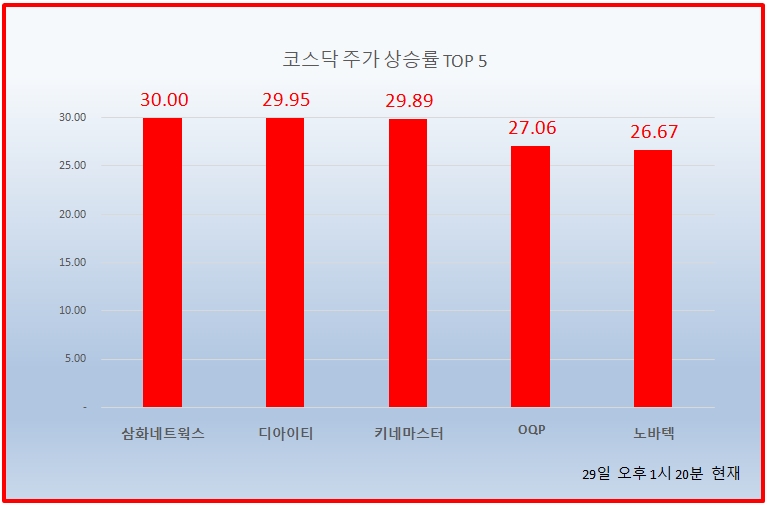 이날 오후 1시 20분 현재 코스닥 상승률 상위 50개 종목은 다음과 같다.