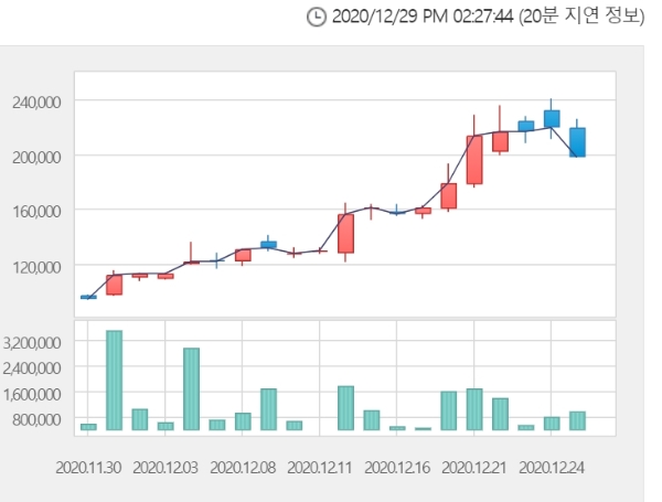 나흘만에 오름세로 가격제한폭까지 오른 상한가다.