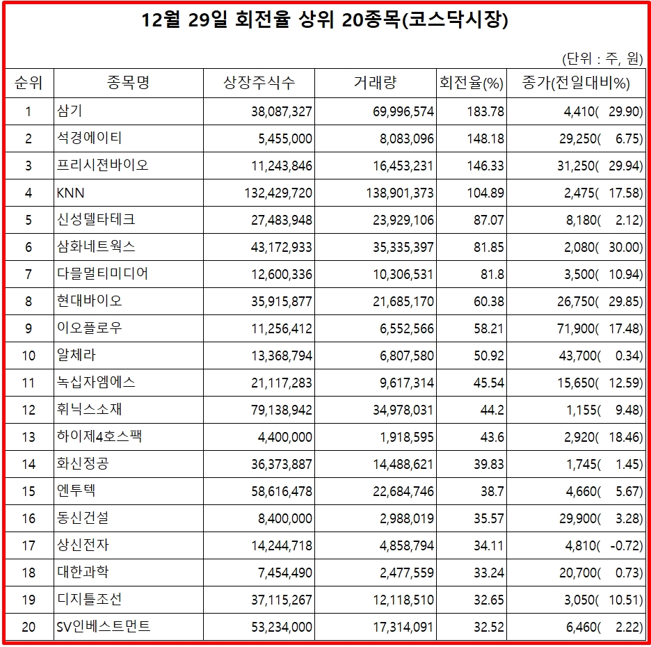 29일 코스닥 시장에서 코스닥 종목의 거래량 회전율 기준 상위 종목은 다음과 같다.