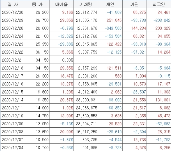 현대바이오 주가는 지난달(2020년 12월 1일-30일) 급등세를 나타냈다. 이 기간동안 주가는 종가기준으로 1만1150원에서 2만9200원으로 162%(1만7770원)이나 뛰었다.