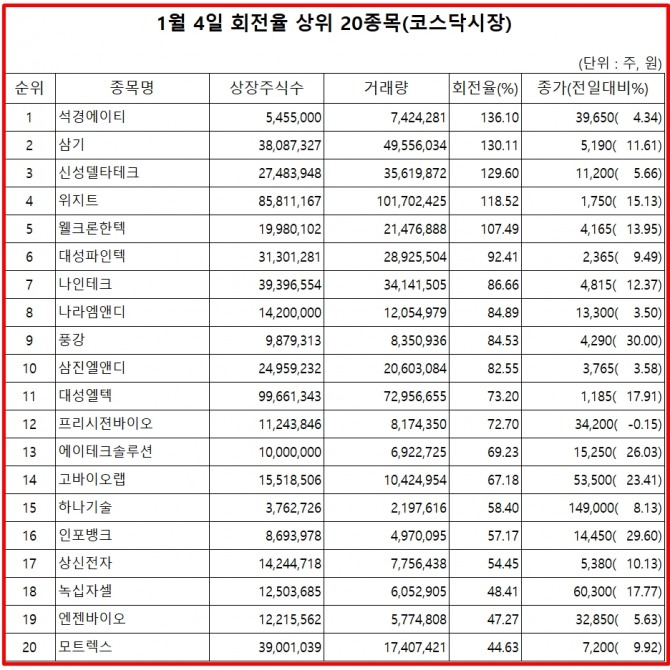 4일 주식시장에서 코스닥 종목의 거래량 회전율 기준 상위 종목은 다음과 같다.
