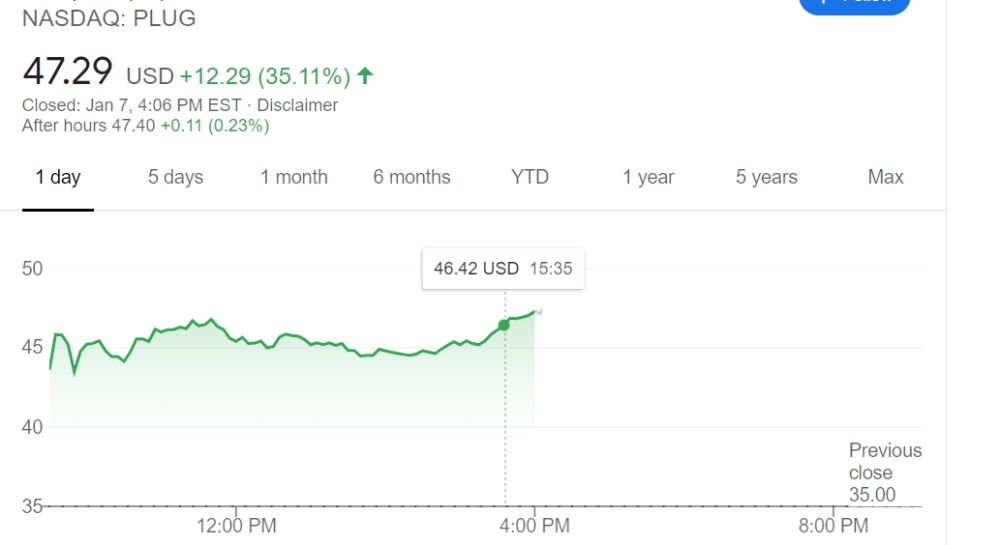이미지 확대보기8일 뉴욕증시에 따르면 이날 플러그파워 (Plug Power) 는 무려 35.11% 상승 마감했다.