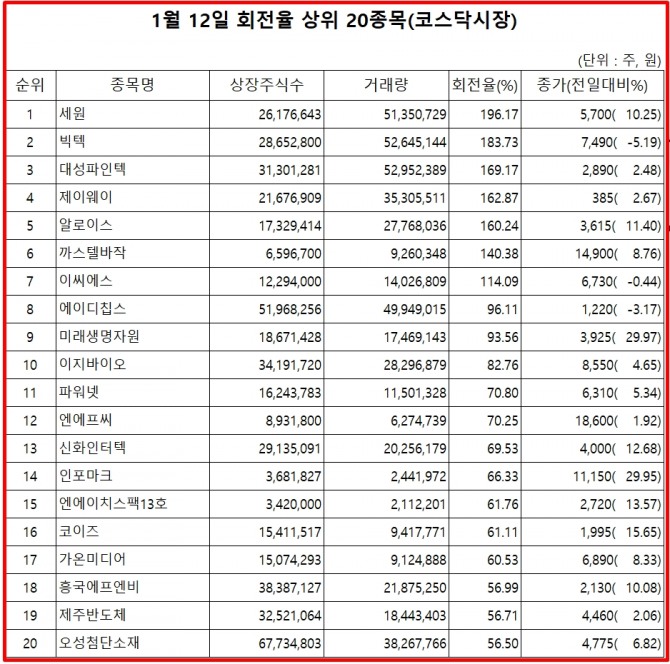 12일 주식시장에서 코스닥 종목의 거래량 회전율 기준 상위 종목은 다음과 같다.