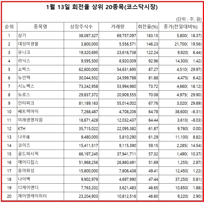 13일 주식시장에서 코스닥 종목의 거래량 회전율 기준 상위 종목은 다음과 같다.