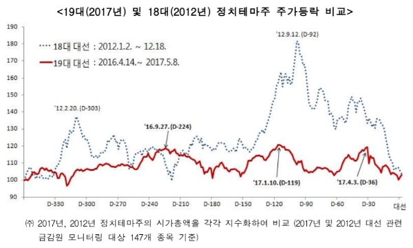 한국거래소 관계자는 “특별한 이유없이 이상급등한 정치테마주에 투자해 손실이 발생한 주체는 대부분 개인이었다”면서 “실적개선 등이 없음에도 정치테마주라는 이유만으로 주가가 급등하는 정치테마주는 투자위험이 매우 높다”고 투자에 주의를 당부했다.