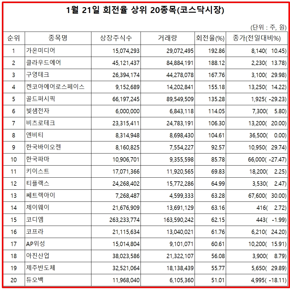 21일 주식시장에서 코스닥 종목의 거래량 회전율 기준 상위 종목은 다음과 같다.