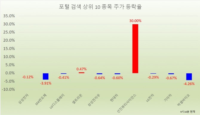 오전 9시 16분 현재 포털사가 집계하는 검색량 기준 상위 20개 종목의 현황은 다음과 같다.
