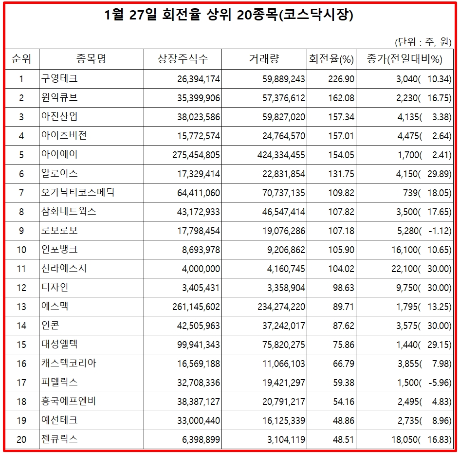 27일 주식시장에서 코스닥 종목의 거래량 회전율 기준 상위 종목은 다음과 같다.