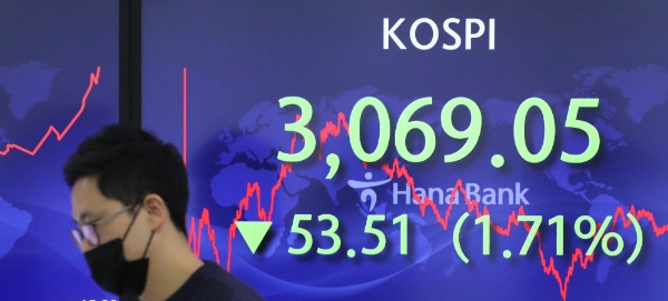 이미지 확대보기28일 한국거래소에 따르면 코스피는 전날 대비 1.71%(53.51포인트) 내린 3069.05에 거래를 마쳤다. 사흘째 하락세다. 코스피는 전장보다 0.24%(7.58포인트) 내린 3114.98에 시작해 장중 한때 2.4%까지 낙폭을 키웠다.