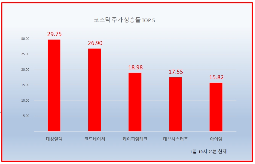 1위 대성엘텍 1570원 ( 29.75% ), 2위 코드네이처 2170원 ( 26.9% ), 3위 케이피엠테크 2915원 ( 18.98% ), 4위 데브시스터즈 37850원 ( 17.55% ), 5위 아이엠 1135원 ( 15.82% ), 6위 드래곤플라이 3400원 ( 12.58% ), 7위 시스웍 2640원 ( 12.1% ), 8위 올리패스 31500원 ( 9.57% ), 9위#셀트리온헬스케어 158000원 ( 9.95% ), 10위 한국가구 5100원 ( 9.68% )