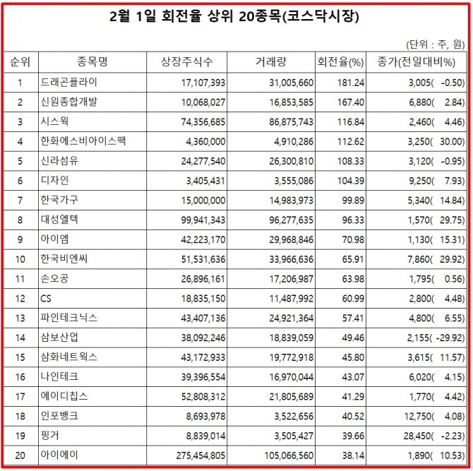 1일 주식시장에서 코스닥 종목의 거래량 회전율 기준 상위 종목은 다음과 같다.
