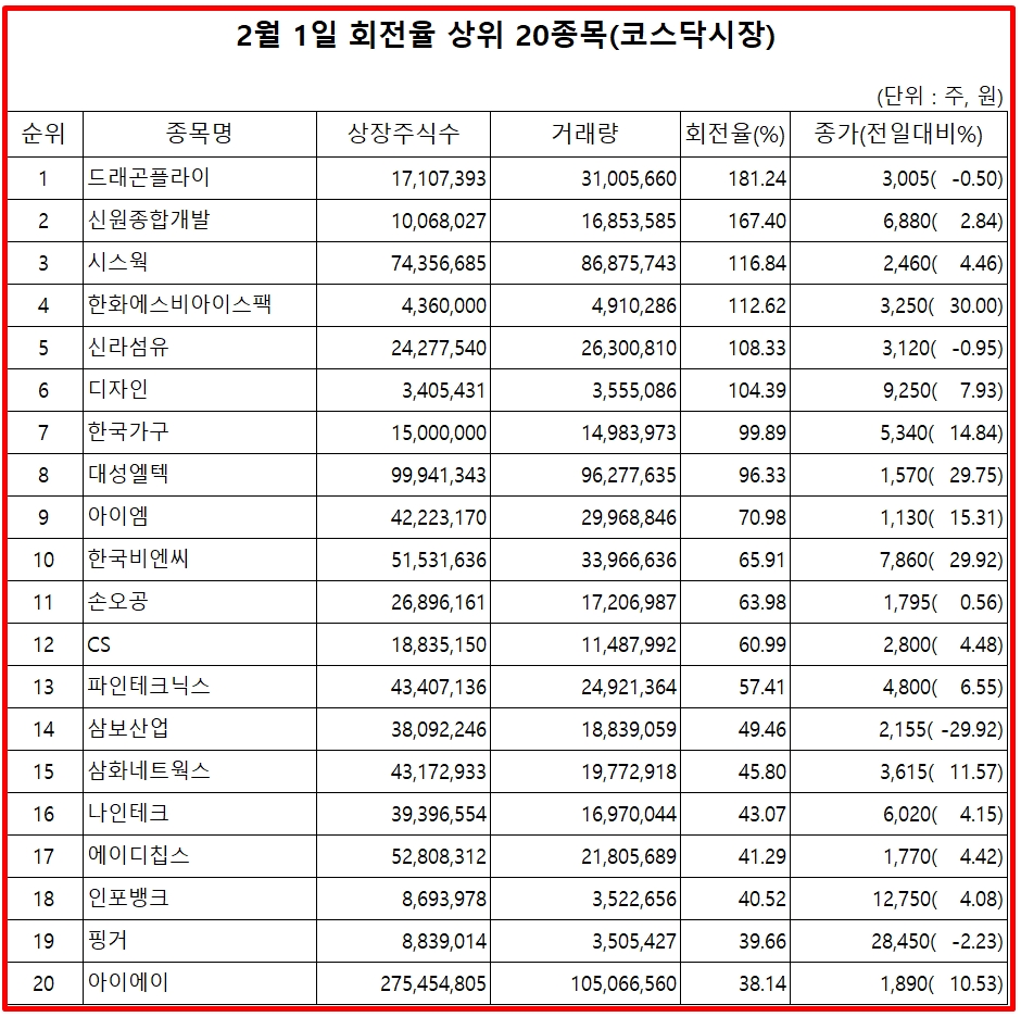 표기순서는 거래량 회전율 순위, 종목명, 거래량 회전율, 1일 종가, 주가 등락율 순이다.
