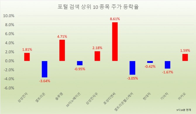 표기 순서는 포털사 기준 검색 상위 랭킹, 종목명, 현재가, 주가 등락률 순이다.