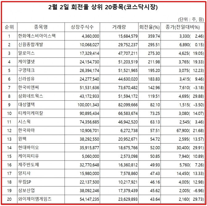 2일 주식시장에서 코스닥 종목의 거래량 회전율 기준 상위 종목은 다음과 같다.