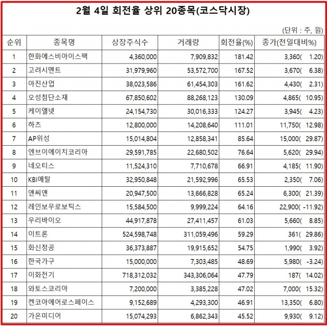 4일 주식시장에서 코스닥 종목의 거래량 회전율 기준 상위 종목은 다음과 같다.