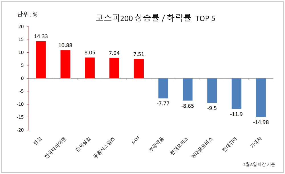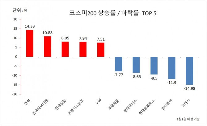 애플카 협력설에 따른 기대감에 그간 큰 폭 상승해 왔던 기아차는 14.98% 하락한 8만6300원으로 마감하면서 코스피200 구성종목 중 주가 하락률 1위를 기록했다.
