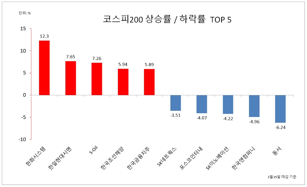 한화시스템 2만550원 +2250 (12.3%), 한일현대시멘 4만2900원 +3050 (7.65%), S-Oil 8만8700원 +6000 (7.26%), 한국조선해양 10만7000원 +6000 (5.94%), 한국금융지주 9만1700원 +5100 (5.89%), HMM 1만5350원 +850 (5.86%), 휴켐스 2만3850원 +1300 (5.77%), 두산퓨얼셀 6만3800원 +3300 (5.45%), 한솔케미칼 23만2500원 +12000 (5.44%)