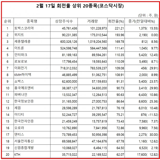 17일 주식시장에서 코스닥 종목의 거래량 회전율 기준 상위 종목은 다음과 같다.