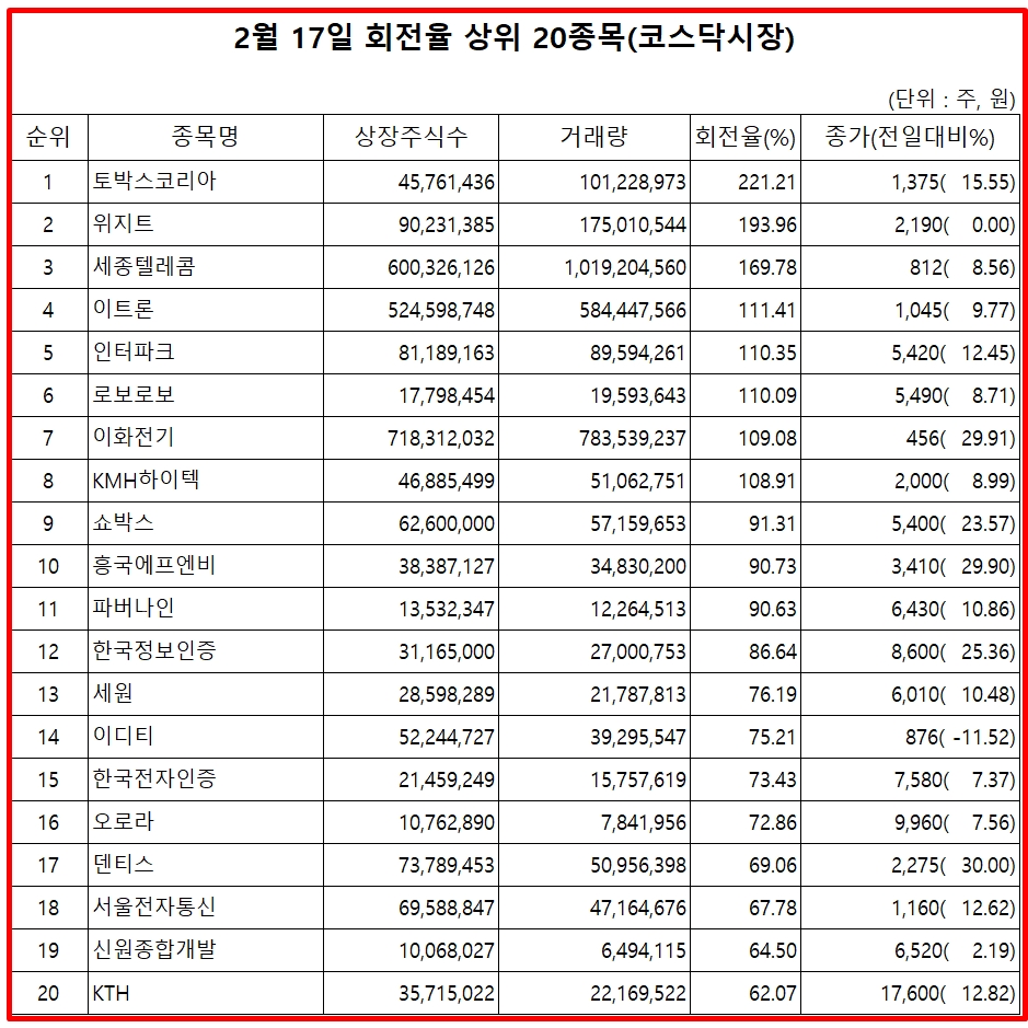 표기순서는 거래량 회전율 순위, 종목명, 거래량 회전율, 17일 종가, 주가 등락율 순이다.