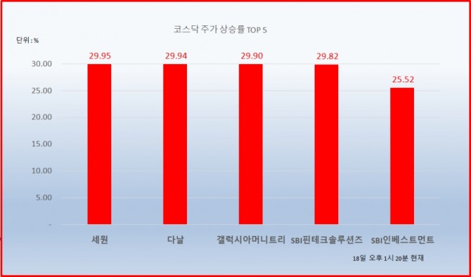 1위 세원 7810원 ( 29.95% ), 2위 다날 8680원 ( 29.94% ), 3위 갤럭시아머니트리 7950원 ( 29.9% ), 4위 SBI핀테크솔루션즈 11450원 ( 29.82% ), 5위 SBI인베스트먼트 1795원 ( 25.52% ), 6위 육일씨엔에쓰 3450원 ( 22.12% ), 7위 자안 390원 ( 22.64% ), 8위 AP위성 19200원 ( 21.52% ), 9위 토박스코리아 1650원 ( 20% ), 10위 인프라웨어 2945원 ( 19.72% )