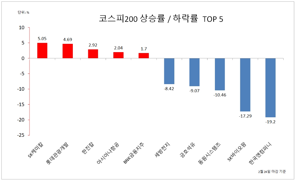 24일 코스피 200 종목 주가 상승률/하락률 상위 5개사 자료=한국거래소