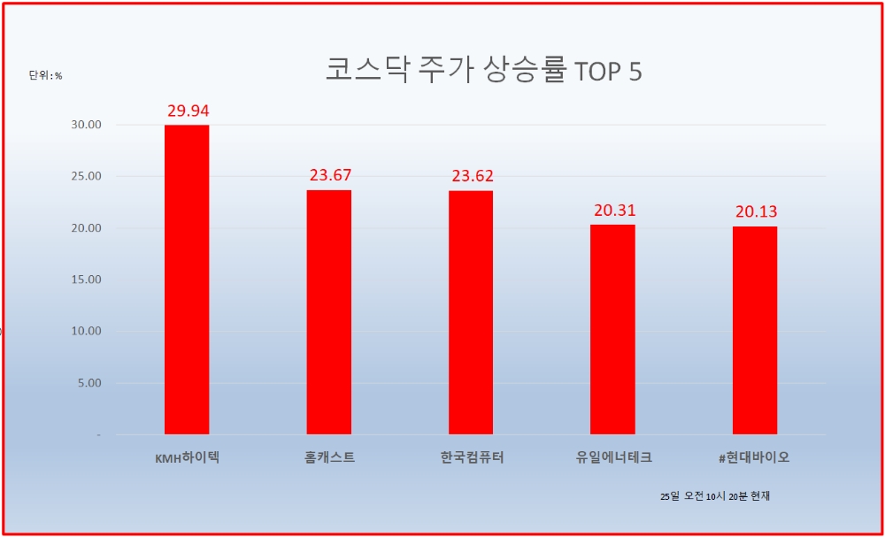 이외에도 한국컴퓨터와 유일에너테크, 현대바이오 등이 20% 넘는 상승을 나타내고 있다.